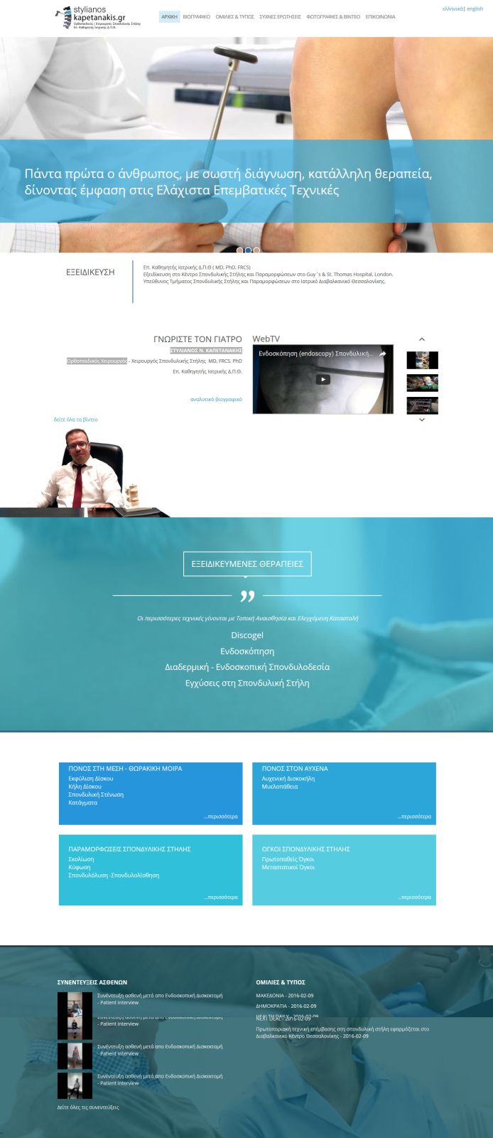 Μελέτη, σχεδιασμός και ανάπτυξη δυναμικής ιστοσελίδας σε 2 γλώσσες του κ. Στυλιανού Καπετανάκη, ο οποίος είναι Ορθοπαιδικός Χειρουργός - Χειρουργός Σπονδυλικής Στήλης.