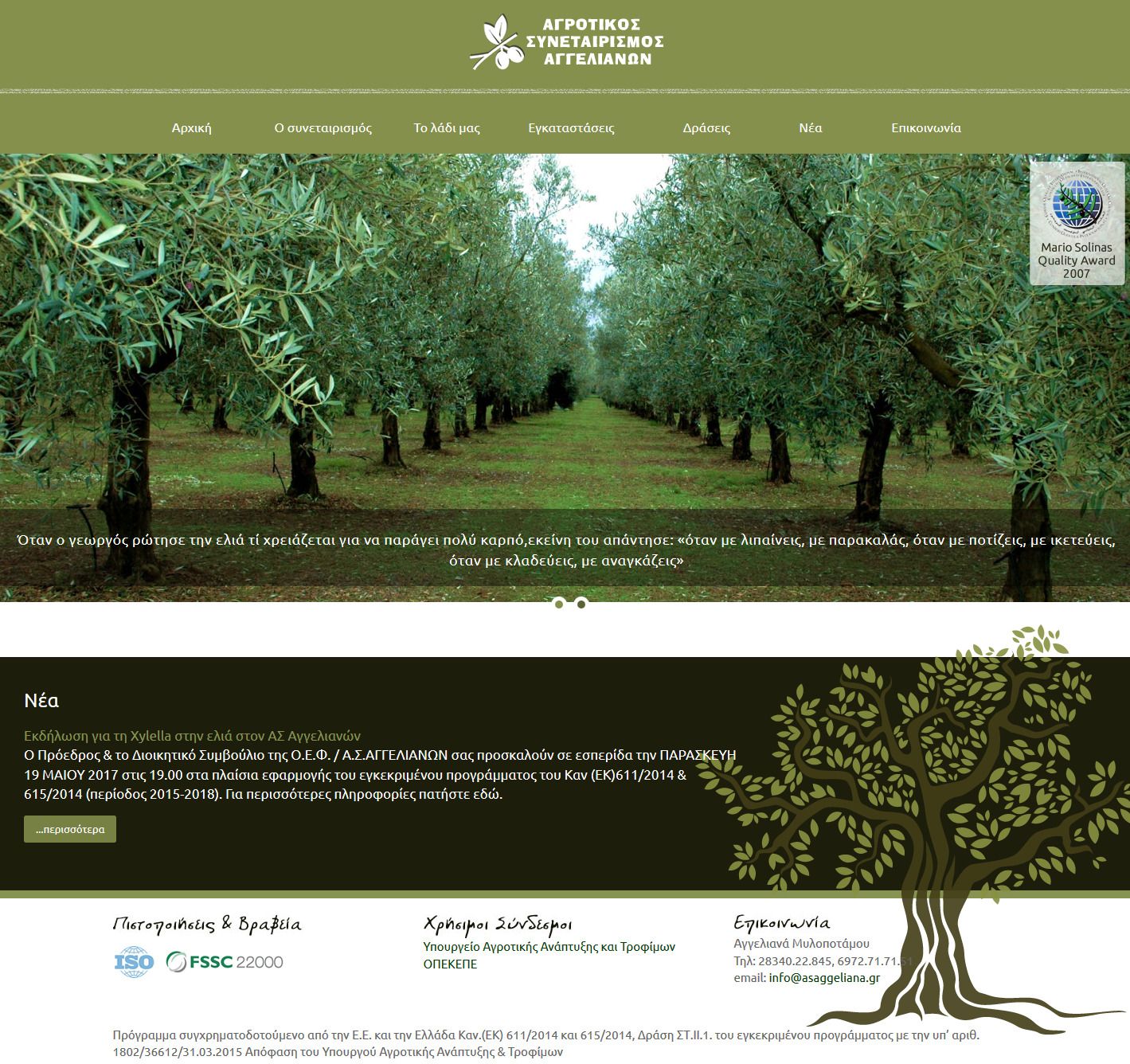 Κατασκευή δυναμικού ιστοχώρου (portal) του Αγροτικού Συνεταιρισμού Αγγελιανών για την άμεση ενημέρωση των αγροτών της περιοχής σχετικά με τα νέα και τις δράσεις του συνεταιρισμού, ενώ ο επισκέπτης έχει την δυνατότητα να βρει πληροφορίες σχετικά με το λάδι και τις εγκαταστάσεις, χάρη στην άμεση ανανέωση του υλικού, μέσω της πλατφόρμας διαχείρισης υλικού HOTcms.