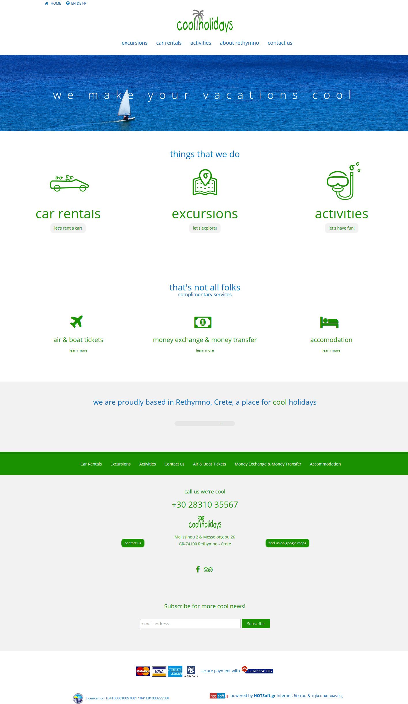 Εξειδικευμένος σχεδιασμός και ανάπτυξη τουριστικού portal σε 3 γλώσσες, βασισμένη στις ανάγκες της επιχείρησης, στην ανάλυση Marketing που προηγήθηκε και στην ευχρηστία - εμπειρία χρήστη. Ο ιστοχώρος βασίζεται σε Responsive web design, ώστε να προβάλλεται σωστά σε όλες τις οθόνες και τις mobile συσκευές. Επίσης έχει γίνει διασύνδεση με payment gateways & σύστημα επεξεργασίας πιστωτικών καρτών για την πραγματοποίηση online booking & payment.