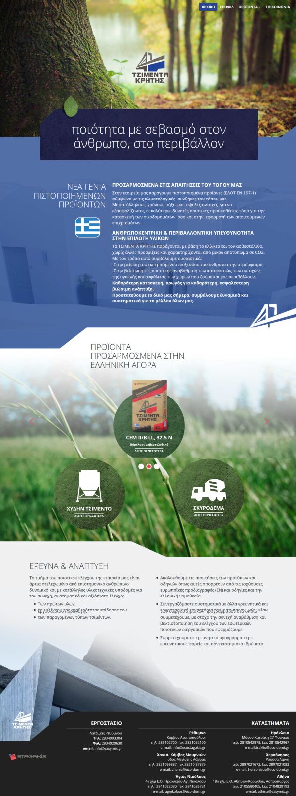 Μελέτη, σχεδιασμός και ανάπτυξη δυναμικής ιστοσελίδας για τα Τσιμέντα Κρήτης, με στόχο την σωστή ανάδειξη των πιστοποιημένων προϊόντων της εταιρείας, τις δράσεις έρευνας και ανάπτυξης άλλα και το οικολογικό της αποτύπωμα.